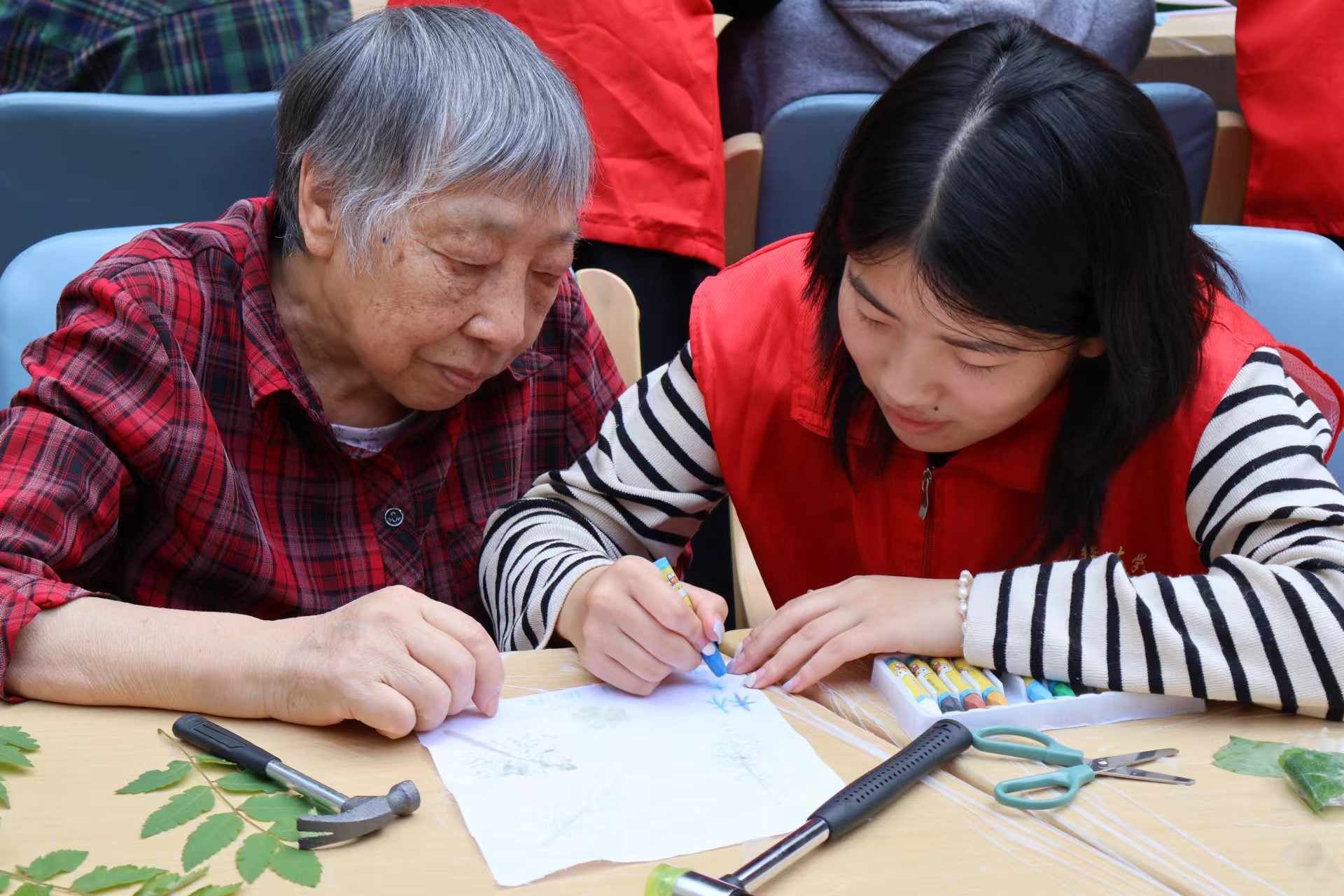 志愿者们各自分组协助每位老人制作自己想要的手工,老人们一边笑着敲动手中的小锤,扭着毛茸茸的扭扭棒,一边和志愿者们唠嗑闲聊,内心的喜悦感透过笑容控制不住地涌出来。