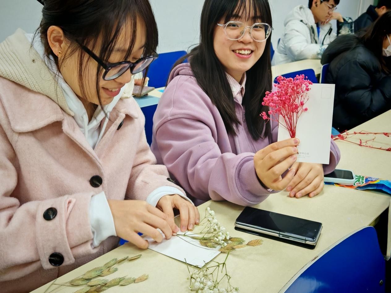 随后,班会转入“寻找心中的春天”板块,其中“花语心声”心理健康活动成为了全场的焦点。同学们热情高涨地参与其中,将自己的希望、祝福以及内心深处的话语,认真地书写在一张张精美的明信片上。为了让这份心意更加独特,大家还精心挑选花朵,为明信片增添了一抹自然的芬芳。在这个过程中,同学们仿佛打开了一扇心灵的