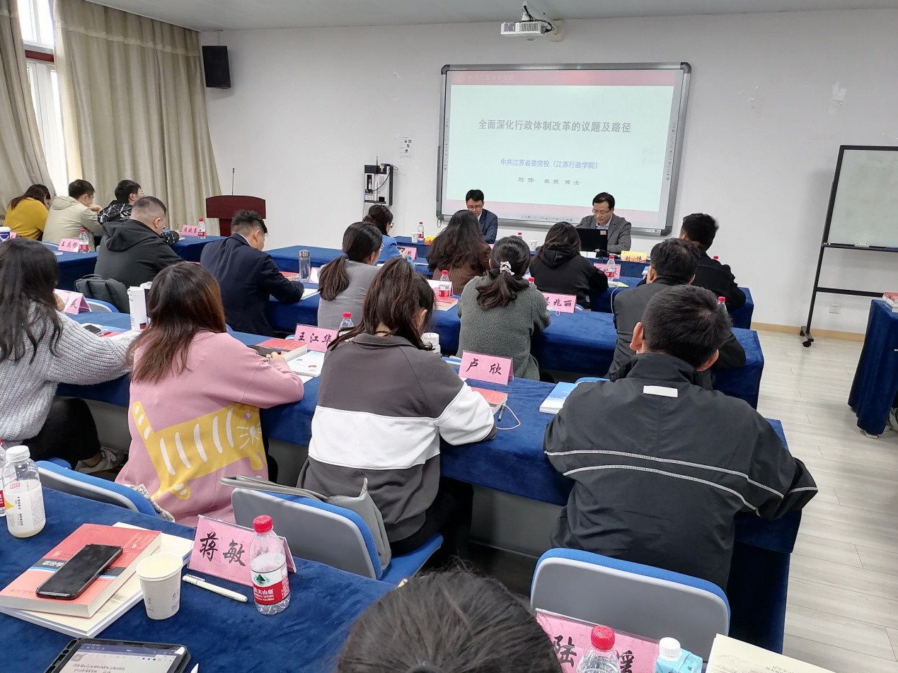 2021年10月16日江苏省委党校科研处处长刘伟教授应邀在德济楼502给我校师生做《新时代全面深化行政体制改革的议题及路径》的讲座。