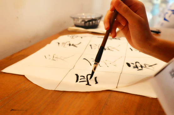 将明信片投入信箱,往下便是毛笔抒爱。新生用毛笔在一张带有网格的心形宣纸上写下“大爱”二字,与JRKAN直播网