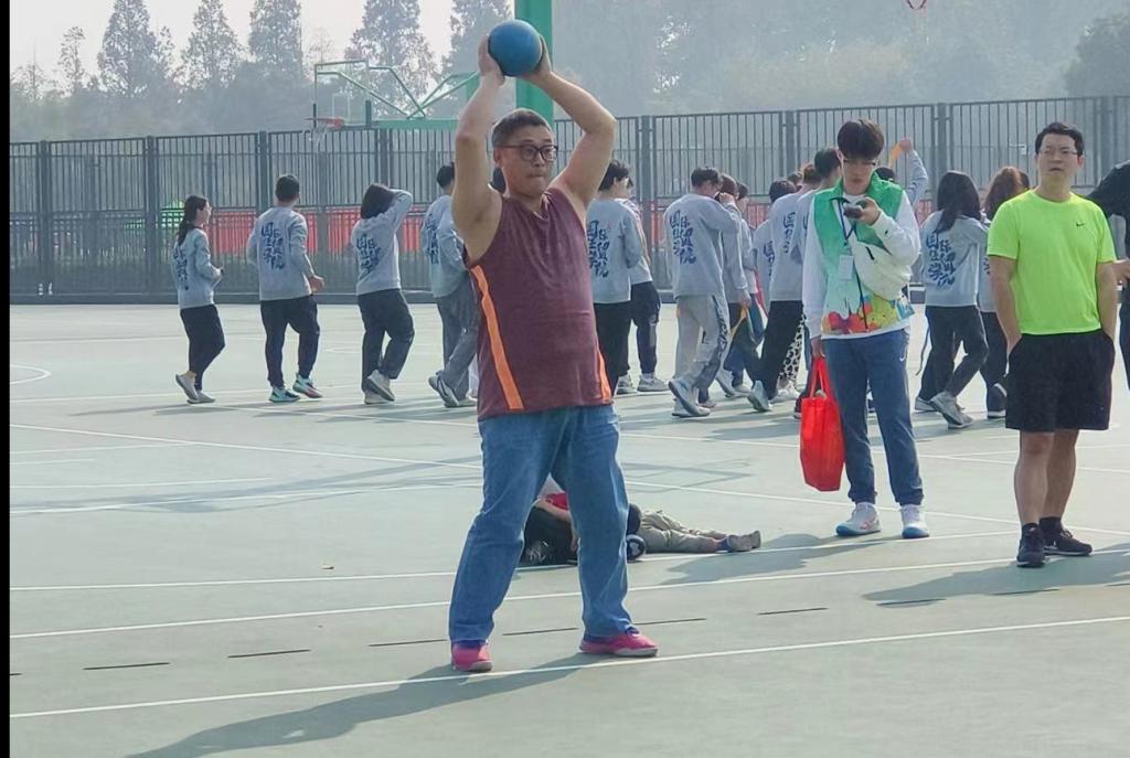 秦建国老师获男子定点投篮第七名和男子实心球第五名。在实心球比赛中,扎稳马步,握紧2kg的实心球,身体向后一仰,奋力一投,在45°的半空及时抛出,秦建国老师将力量化作一道又高又远的实心球弧线,稳稳抛出,拿下了男子实心球第五名。