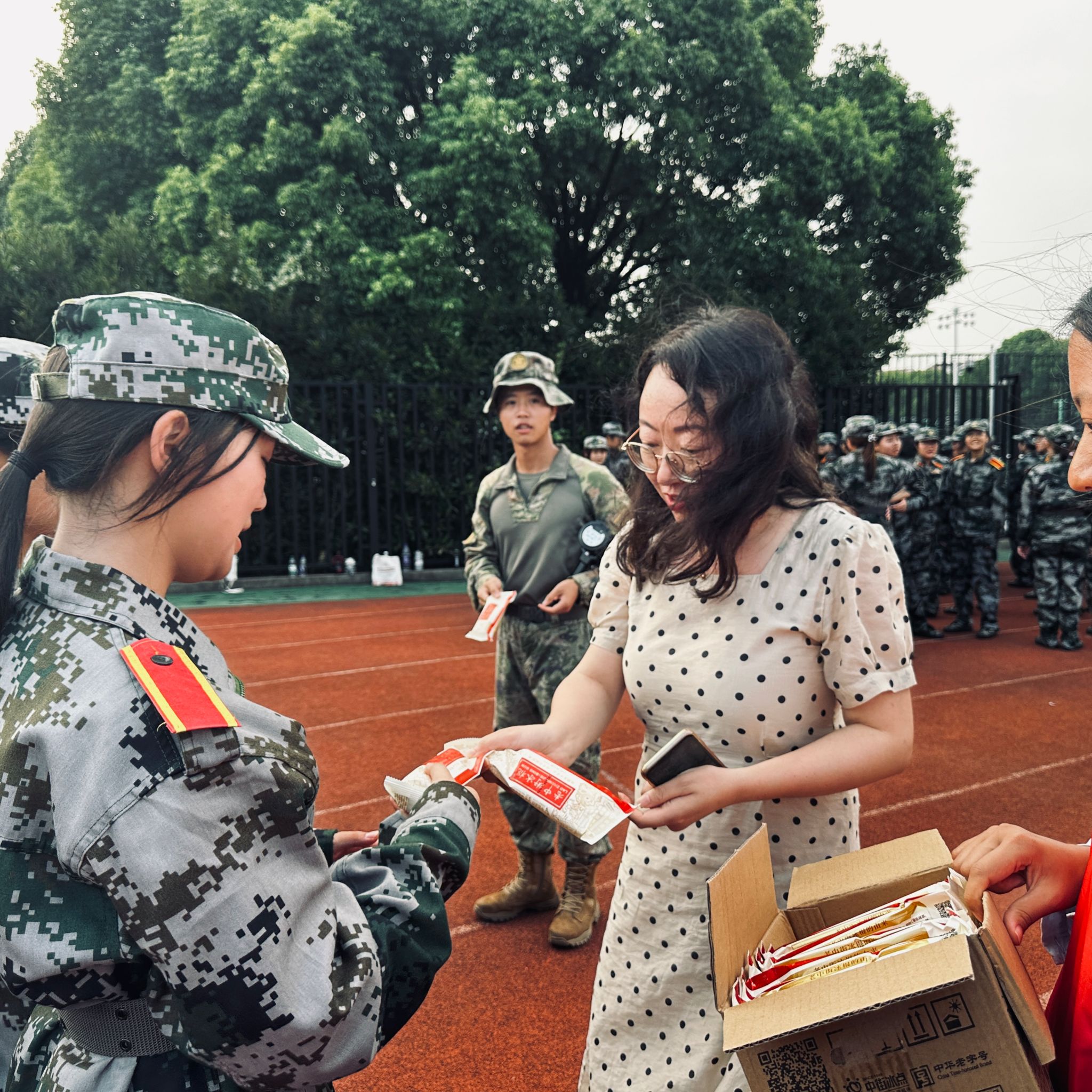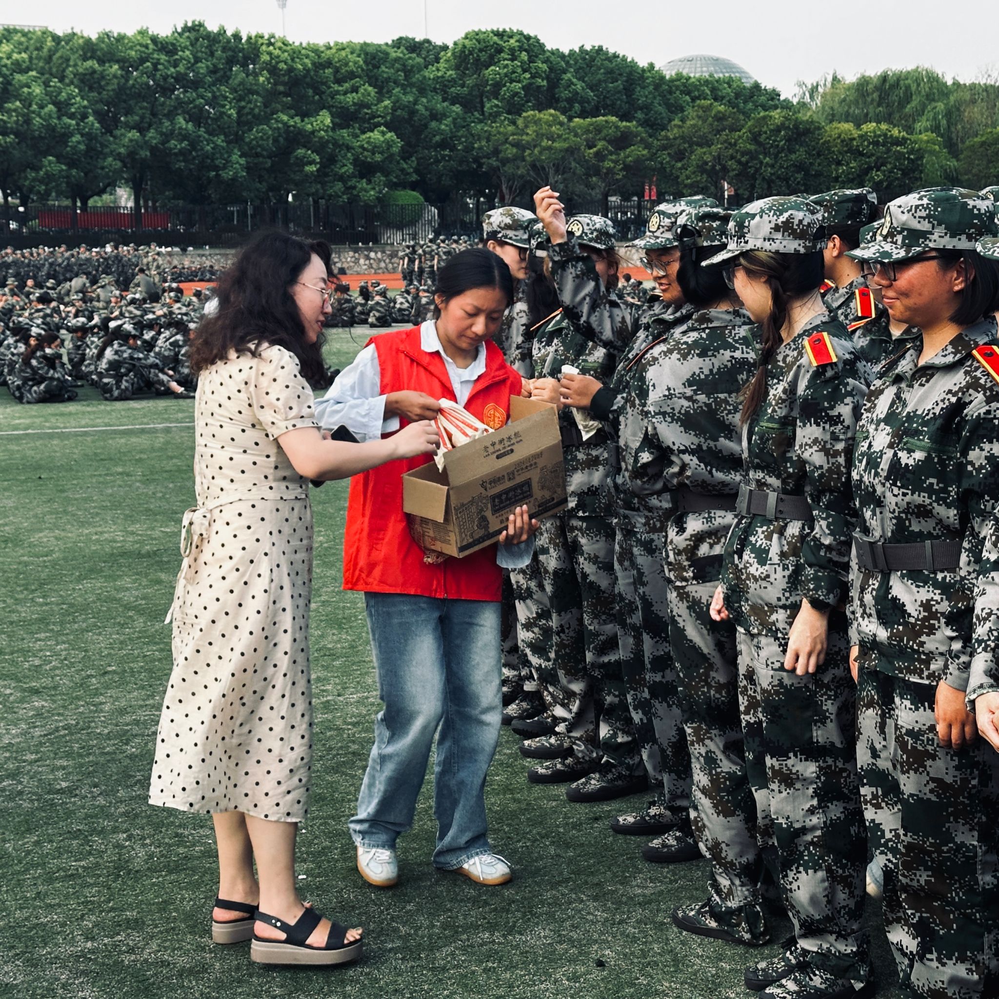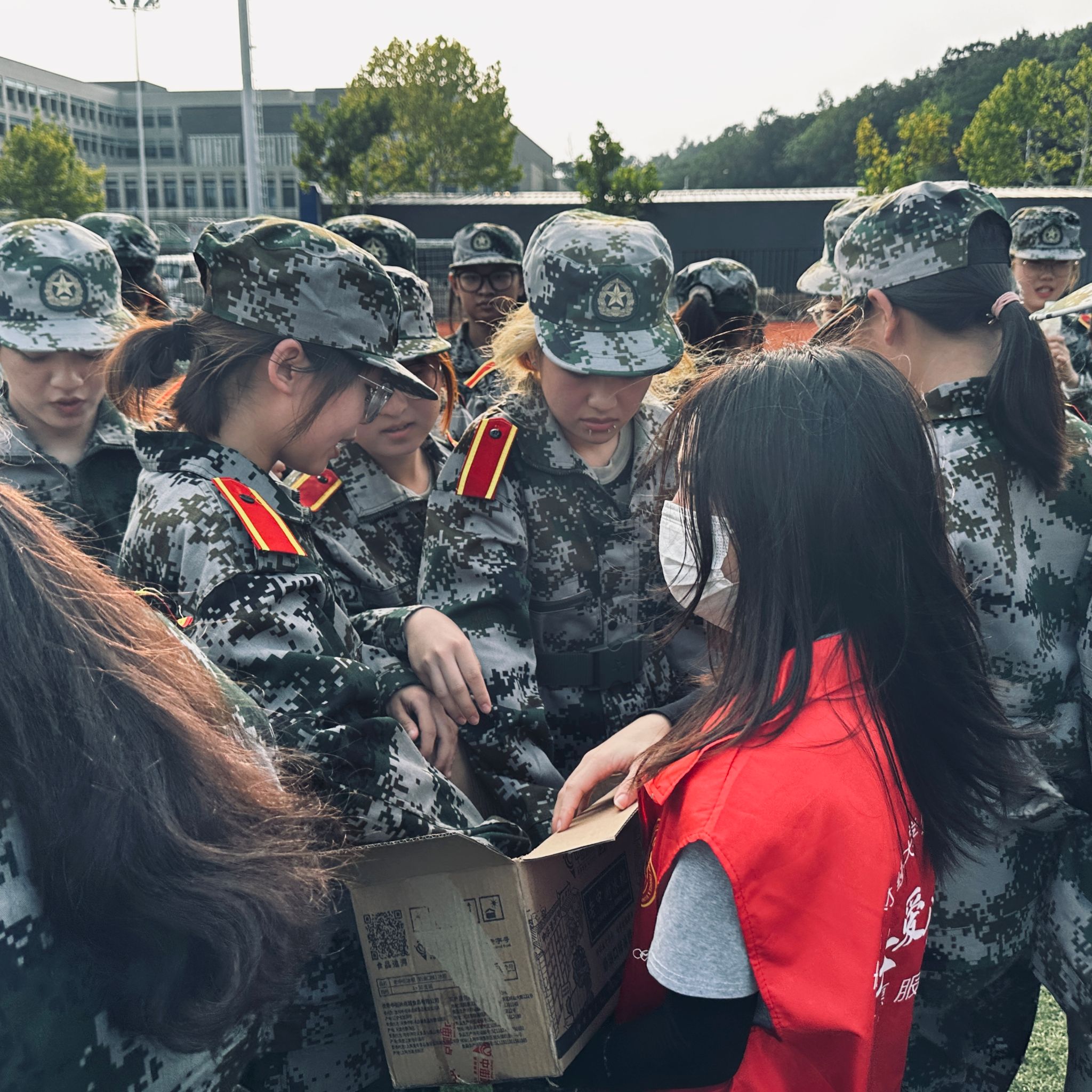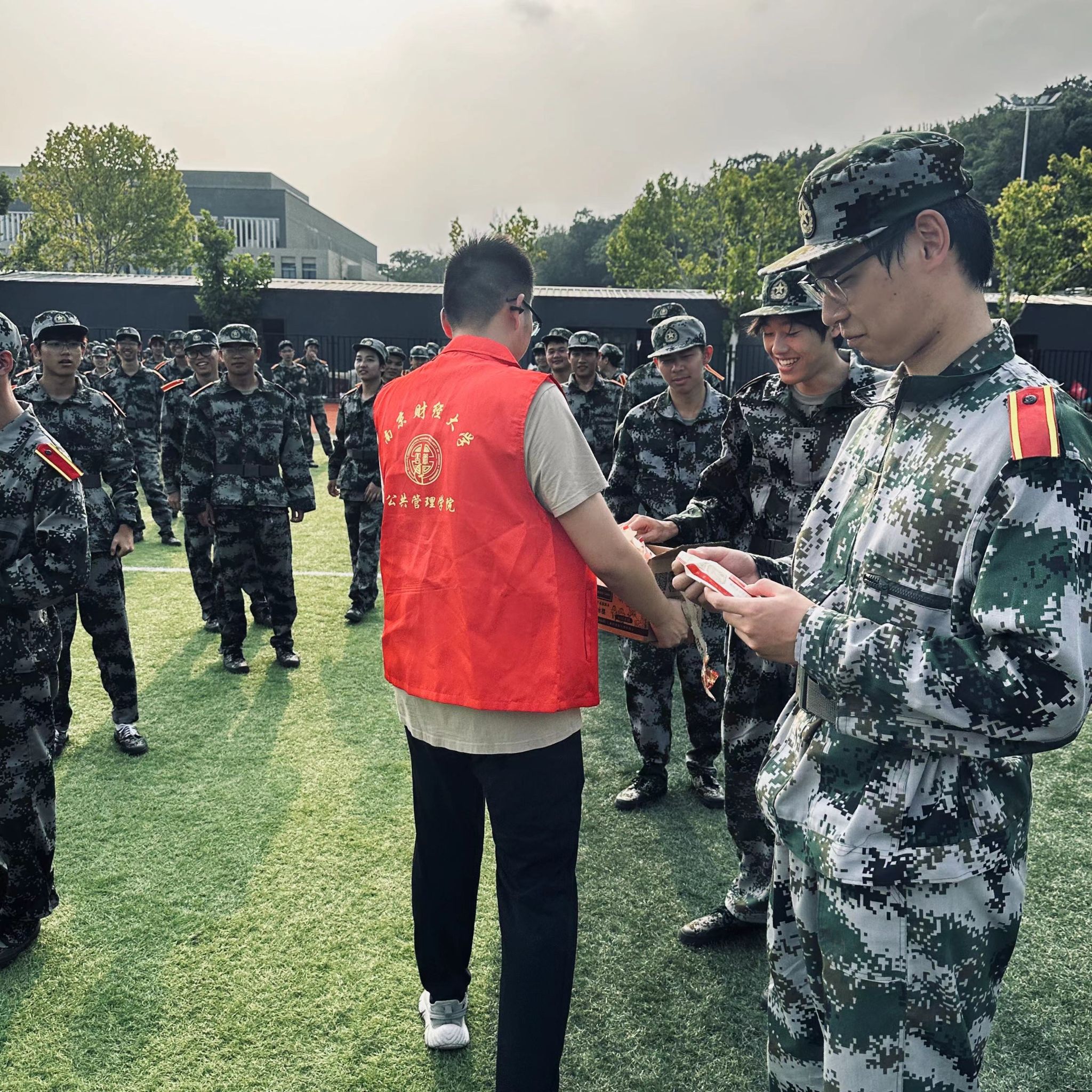 于是,当新生辅导员尹杰老师和穿着红色马甲的公管院志愿者们出现在一片迷彩服之间时,大一新生和大二同学们都一脸惊讶和欣喜。