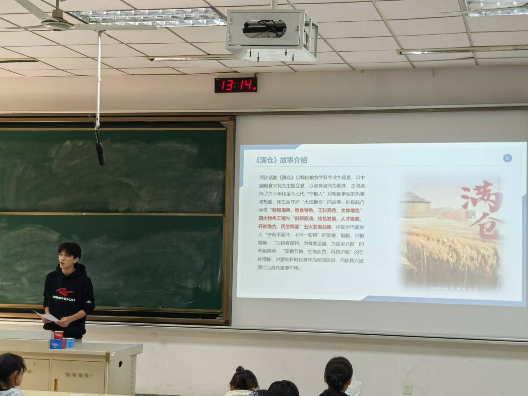 最后,话剧《满仓》的主演公事管2201班陶吉同学分享他与《满仓》的故事。该话剧以我校粮食专业为背景,展示了我校精神及风貌,陶吉通过分享他的演出经历,向我们介绍了何为在多元舞台上绽放青春,展现初生骄阳之艳。他的优秀故事感染了同学们,让大家受益匪浅、卒有所获。