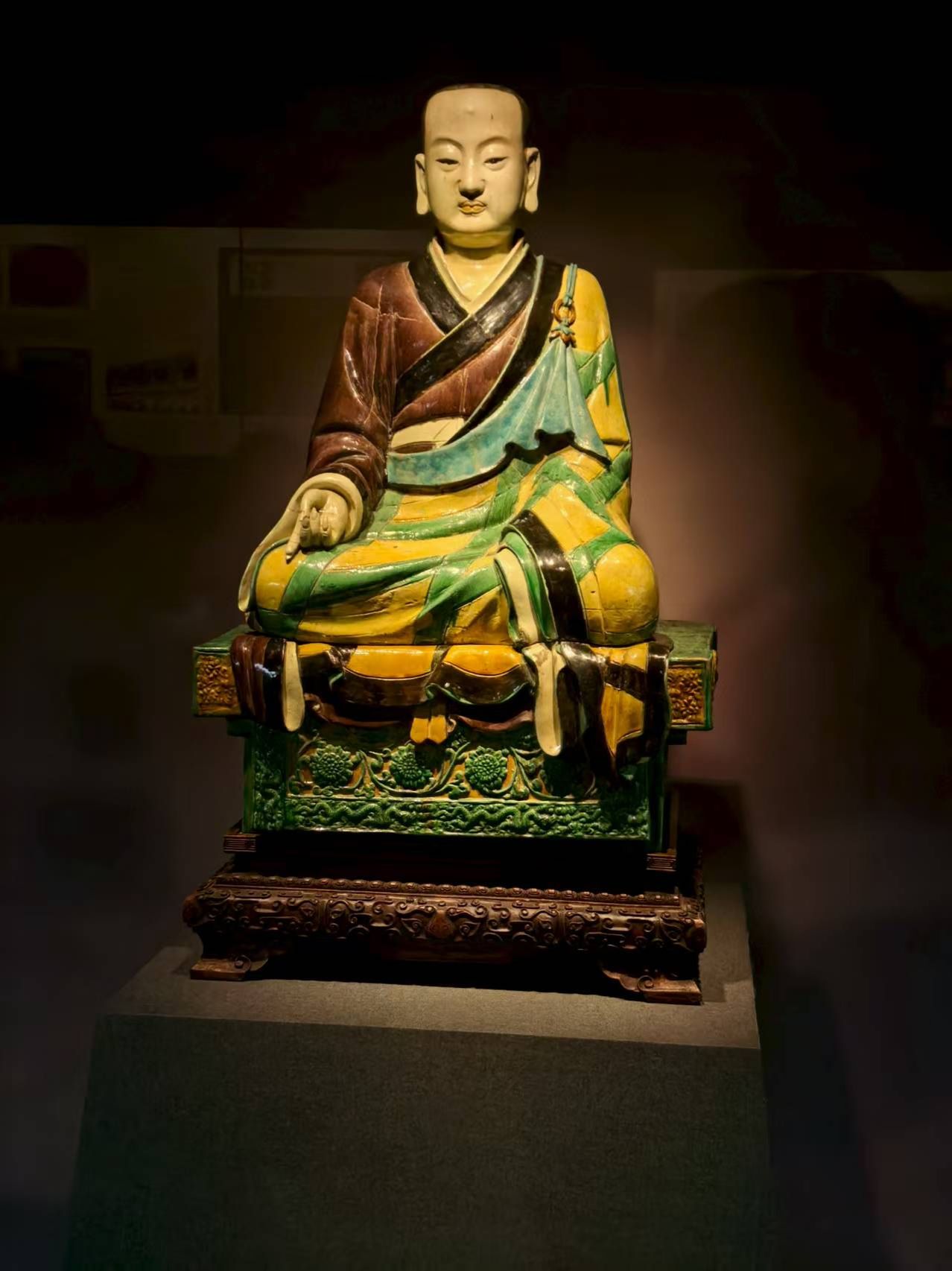 下午3时许,团队来到特展展厅。在雕塑展区,一尊明代三彩琉璃罗汉坐像令人叹为观止。罗汉面容慈祥,衣纹流畅,琉璃釉色斑斓绚丽,体现了明代琉璃烧造技艺的高超水平。塑像背后的工艺复杂,需要经过塑形、烧制、施釉、再烧等多道工序,每一道工序都需要匠人的精心制作。