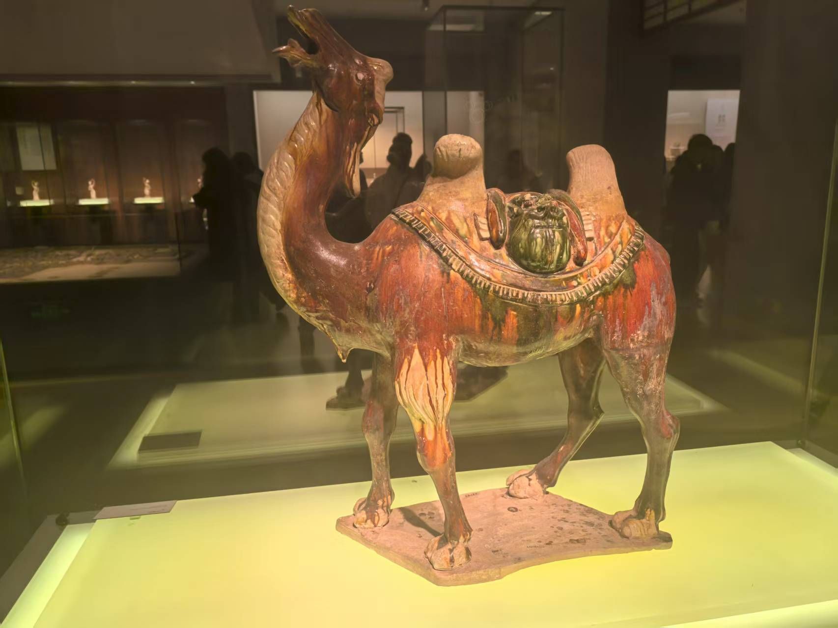 团队特别驻足于唐代文物展区,一尊唐三彩骆驼栩栩如生。骆驼双峰挺拔,釉色流淌自然,绿、红、黄三色交织,展现了唐代丝绸之路上中外文化交流的盛况。这件文物不仅造型生动,更反映了唐代开放包容的文化态度。