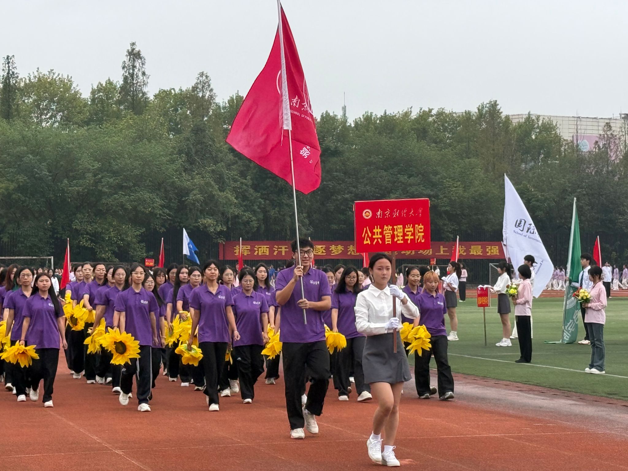 南京财经大学2025年田径运动会圆满落幕。秋日赛场上的汗水与呐喊,都已凝结为公管人共同的青春记忆。身着紫色战袍的健儿们,在个人项目中挑战自我,在团体协作中诠释默契。愿这份赛场上的拼搏精神,继续在未来的征途中闪耀,激励每一位公管人在更广阔的人生赛道上永不止步!