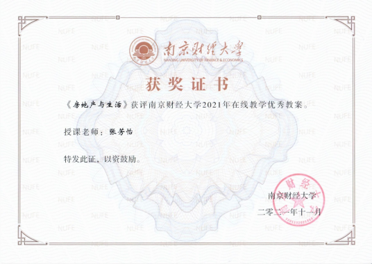 近年来房地产系不断强化教学改革,提升教学质量,打磨教学内容,由张芳怡老师授课的《房地产与生活》获评了南京财经大学2021年在线教学优秀教案。