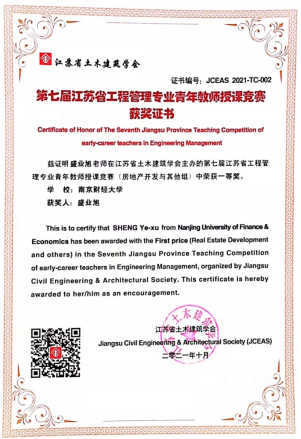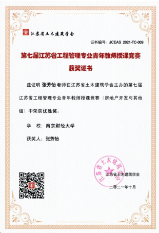 2021年10月31日房地产系盛业旭、张芳怡两位老师参加了由江苏省土木建筑学会主办的“第七届江苏省工程管理专业青年教师授课竞赛”,盛业旭老师和张芳怡老师分别荣获房地产开发组的一等奖与优胜奖。
