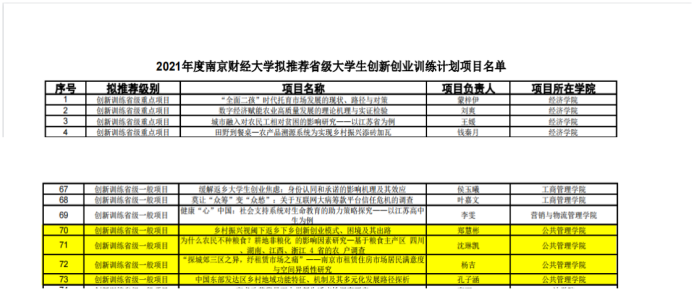 2021年度,由房地产开发与管理专业学生郑慧彬同学主持的《乡村振兴市阈下返乡下乡创新创业模式、困境及其出路》、沈琳凯同学主持的《为什么农民不种粮食?耕地非粮化的影响因素研究》、杨吉同学主持的《“探城郊三区之异,纾租赁市场之痛”》、孔子涵同学主持的《中国东部发达地区乡村低于功能特征、机制及其多元化发展路径探析》共同获批2021年度江苏省大学生创新创业训练计划项目。