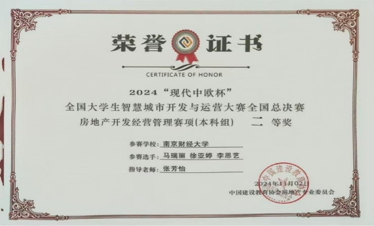 经过激烈的角逐,我院参赛队伍(成员:李思艺、马瑞丽、徐亚婷,指导老师:张芳怡)在智慧城市开发与运营房地产方向上表现出色,荣获二等奖。此次比赛不仅考验了学生们在房地产开发与运营领域的专业知识和实践能力,更展现了她们卓越的团队协作精神和创新能力。