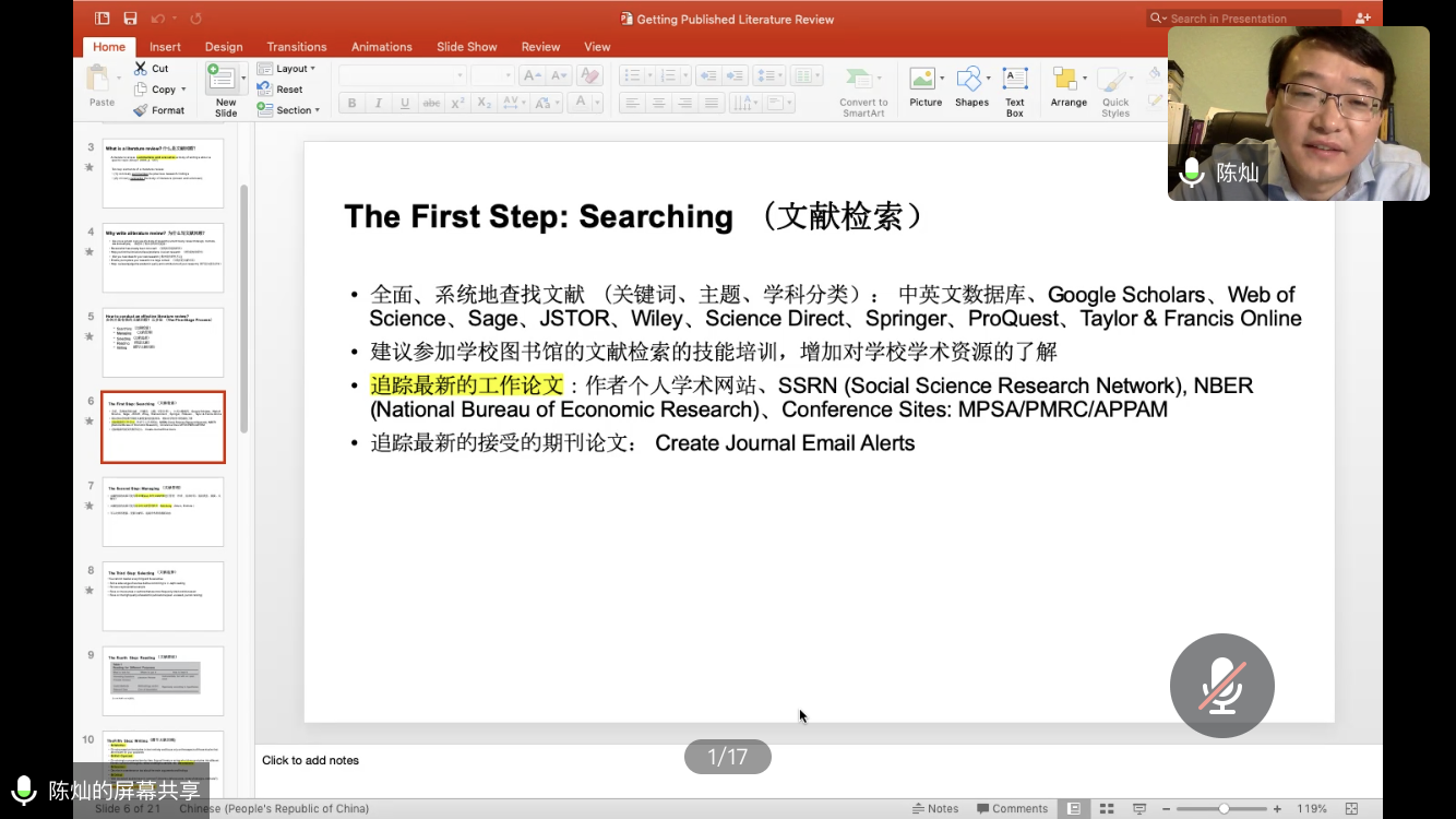 随后,陈灿助理教授具体阐述了开展有效文献回顾的五步法,重点包括进行有效文献管理的常用工具、高效选择文献的要点、以目标为导向的文献精读方法、撰写文献综述的四要素,解释了“系统性论述”的重要概念。陈教授以自身经历为例,分享自己在投稿过程中收获的宝贵经验和教训。