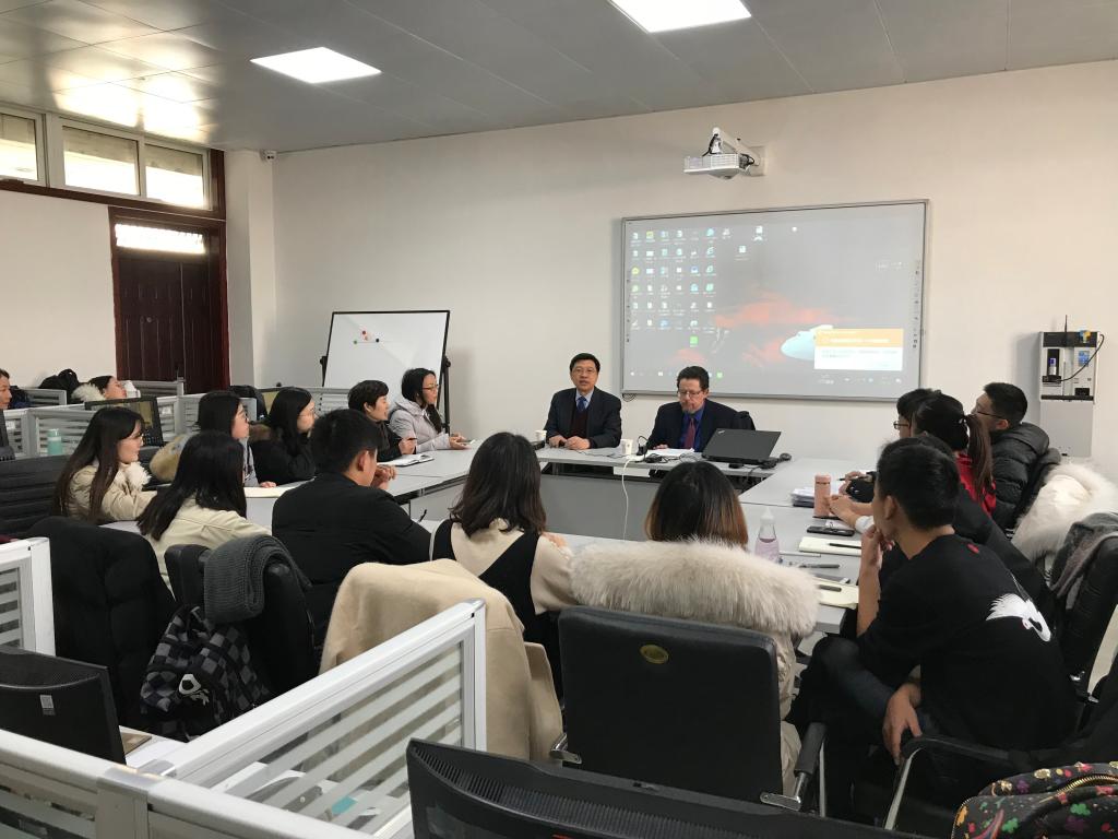 1月18日下午,应JRKAN直播网 邀请,伊利诺斯-斯普林菲尔德大学公共事务与行政JRKAN直播 院长Robert Smith教授和美国克莱姆森大学中国研究中心主任胡晓波教授来JRKAN直播网 讲座,主题为“The Trump Factor in American Politics and the International and Sino-US Relation”。讲座在JRKAN直播网 研究生实验室举行,由院长黄斌教授主持,JRKAN直播网 全体研究生和部分老师聆听了讲座。