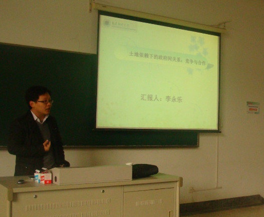 紧接着,李永乐副教授通过对土地征收、土地出让、土地规划等基本土地制度分析为基础,详细论述了土地缘何成为当前地方政府在三维立体架构下的行为选择落脚点,并指出地方政府趋于一致的策略选择导致了土地资源的不合理利用。