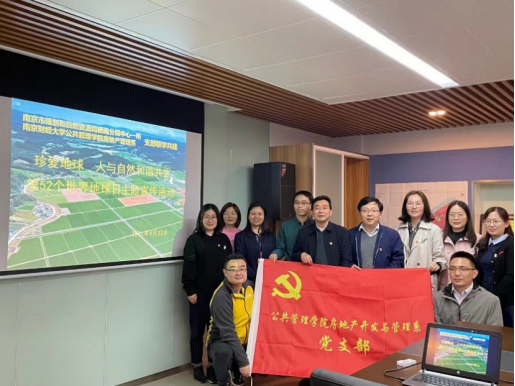 房地产开发与管理教工党支部与栖霞分局中心一所党支部共建活动为载体,开展“世界地球日”主题宣传活动。南京市规划和自然资源局栖霞分局副局长周根宝同志、中心一所党支部书记杨炬烽同志以及JRKAN直播网