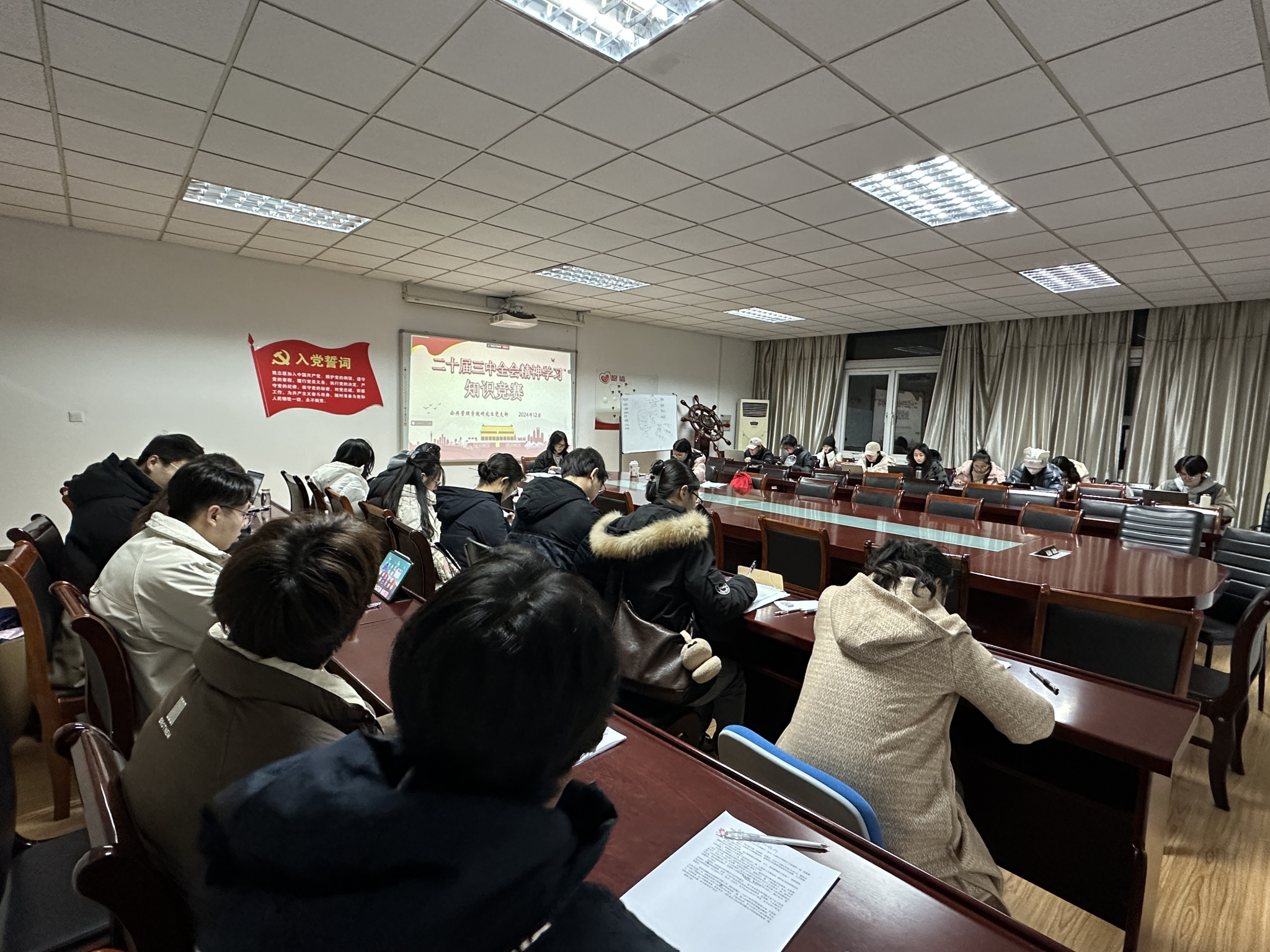 研究生党支部于12月19日晚19:00在德济楼508召开党日主题学习会议,由党支部书记丁洁为大家讲授“持续深入学习贯彻党的二十届三中全会精神”专题党课,并组织党员参加该主题知识竞赛。