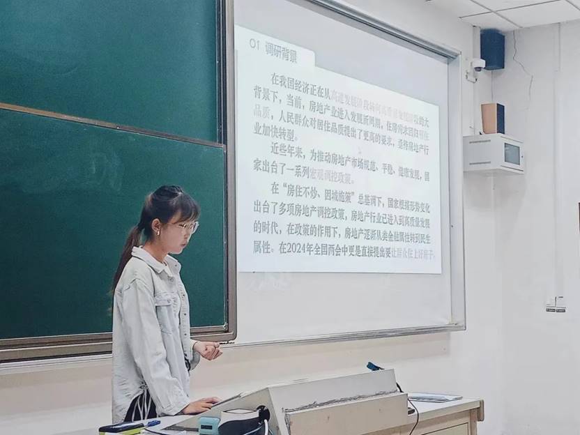 “有恒产者有恒心”,房地产2301班的王嘉同学为我们分享他们团队关于以南京为例--房地产转型期住宅品质提升路径调查研究。实地考察收集素材,进行采访,了解文创后不断完善调研。探究住房绿化等因素对商品住宅的影响,为房地产转型与居民生活保障做出了自己的贡献。