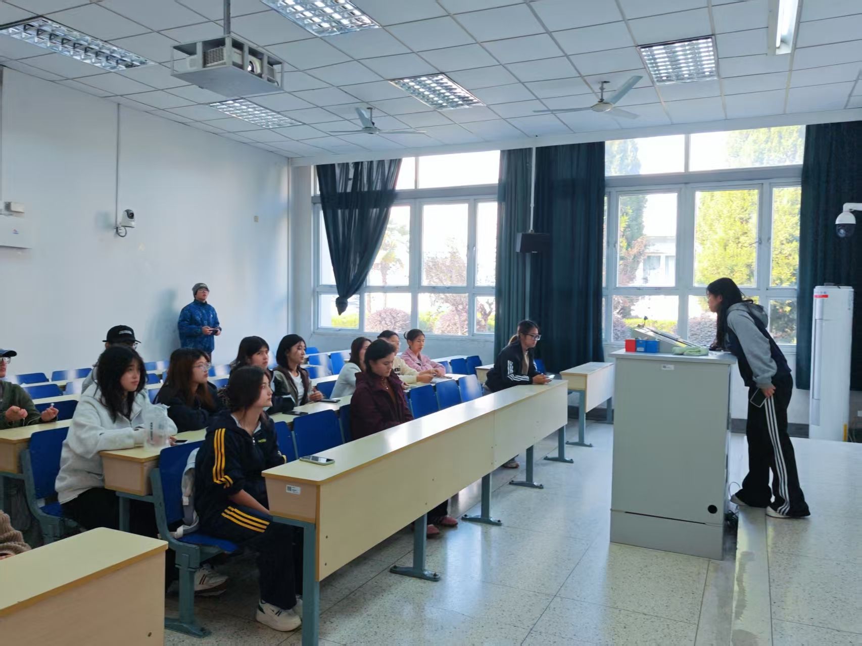 活动伊始,班长娜迪热·阿迪力结合PPT展示了青藏铁路、新疆棉田现代化建设等祖国重大工程中的民族团结故事,讲述各民族建设者携手扎根一线、共筑发展的历程,让同学们直观看到民族同心在国家建设中的重要作用。随后的分组讨论环节,同学们围绕“新时代大学生如何在专业学习中融入民族情与爱国心”展开交流,劳动与社会保障专业的同学结合专业特点,提出要关注民族地区社保体系建设、助力边疆民生发展的想法;部分同学分享了暑期参与民族地区支教、基层调研的经历,讲述自己在实践中感受到的各民族互帮互助的温暖。
