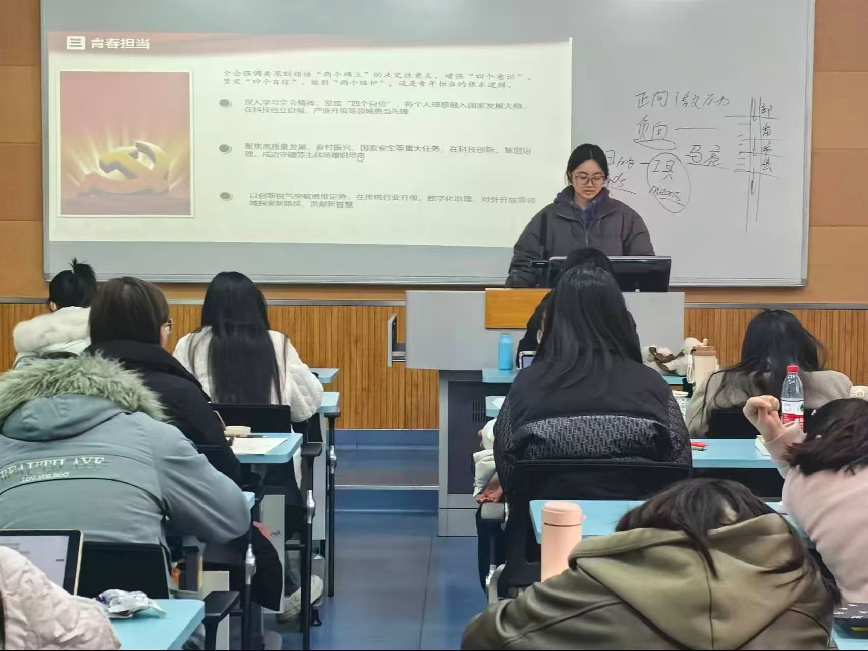 12月5日,行政管理2301团支部于教室内成功举办了一场主题团日活动,深入学习党的二十届四中全会精神。活动由团支书黎莹莹主持,旨在引导团员青年把握时代脉搏,明确青春担当。