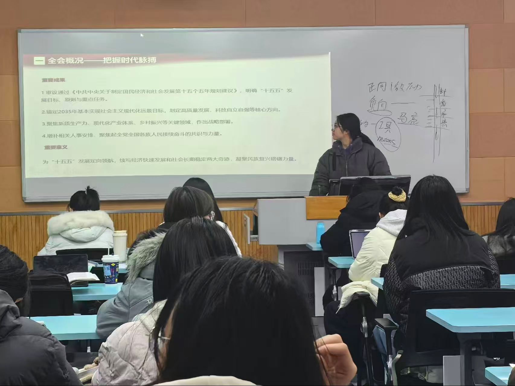 学习过程中,现场气氛活跃,互动频繁。当谈到“青春担当”时,一位同学结合专业提问:“我们行政管理专业的学生,如何在基层治理中落实全会精神?”主持人回应道,这正是全会精神的实践要求,鼓励大家未来在岗位上运用数字化思维提升治理效能,在解决群众急难愁盼问题中践行人民至上理念,将个人成长融入国家治理体系和治理能力现代化的伟大进程。